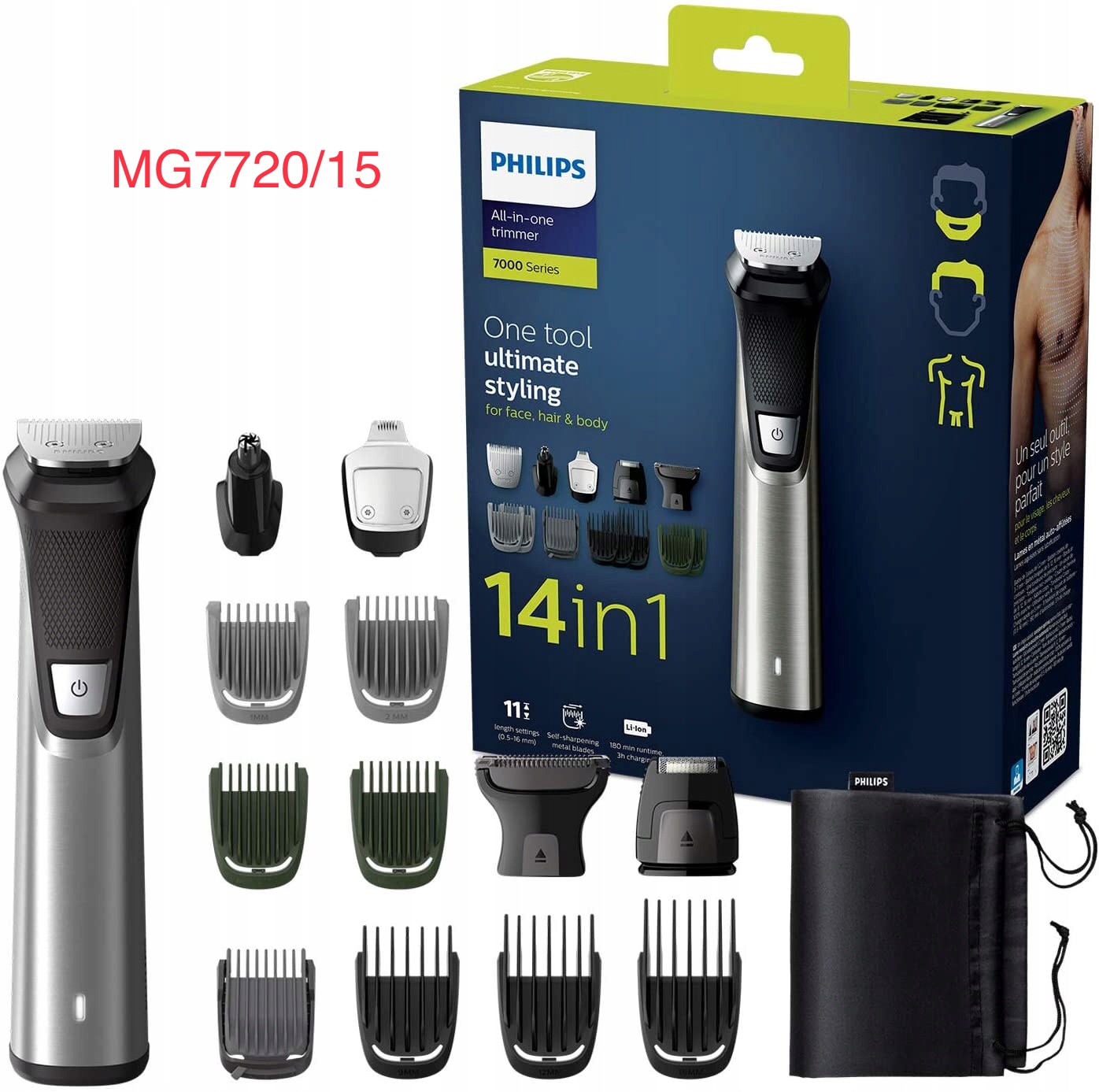 Philips MG7720/15, Recortador para Cara, Cabello y Cuerpo 14 en 1, 120 min de autonomía,